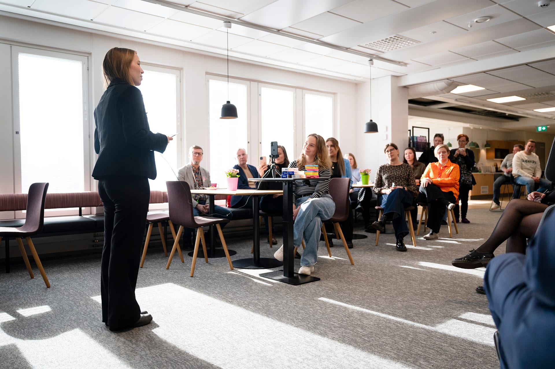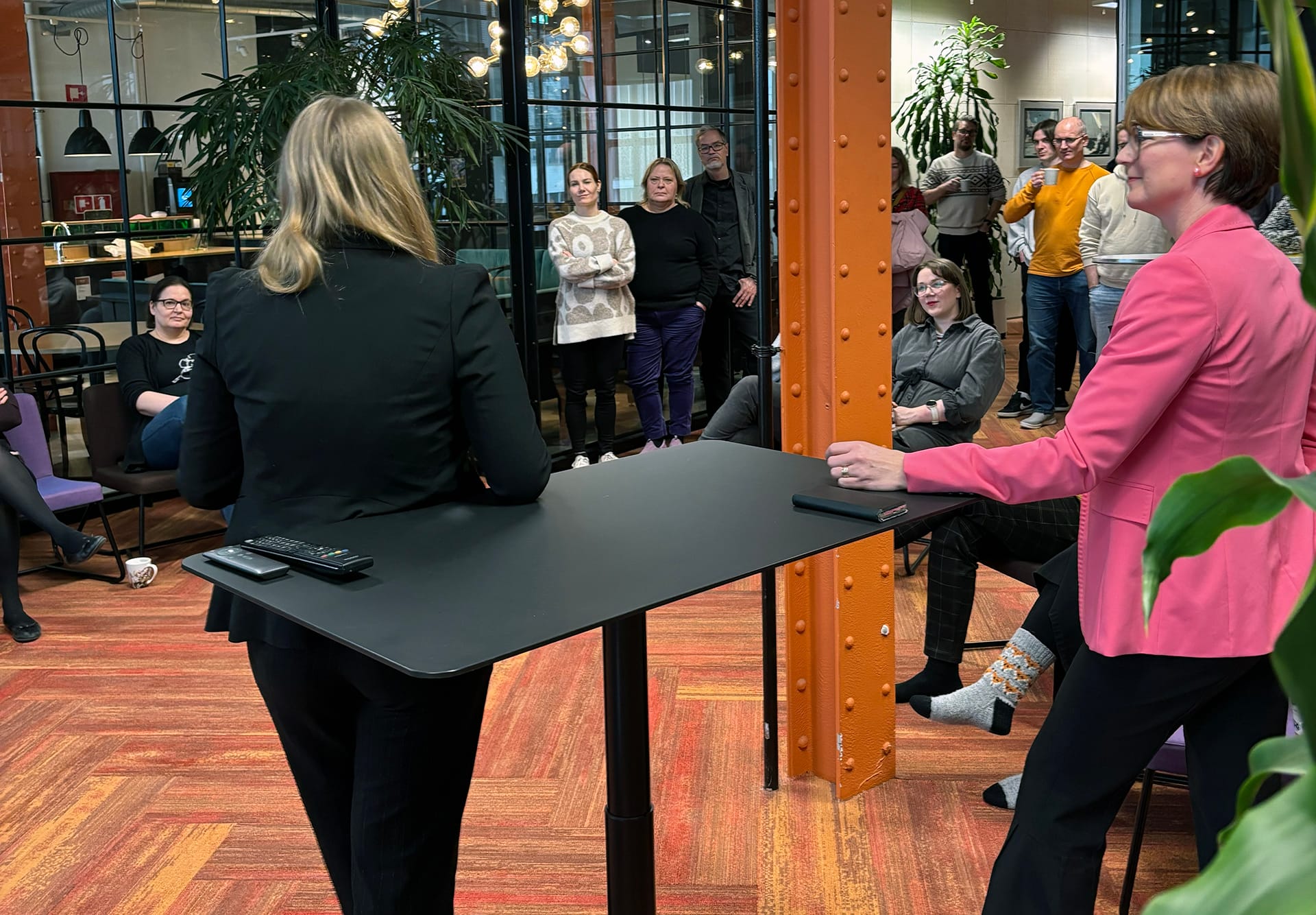 Päätoimittaja Sanna Keskinen kiitti päivän päätoimittajaa tärkeistä huomioista.