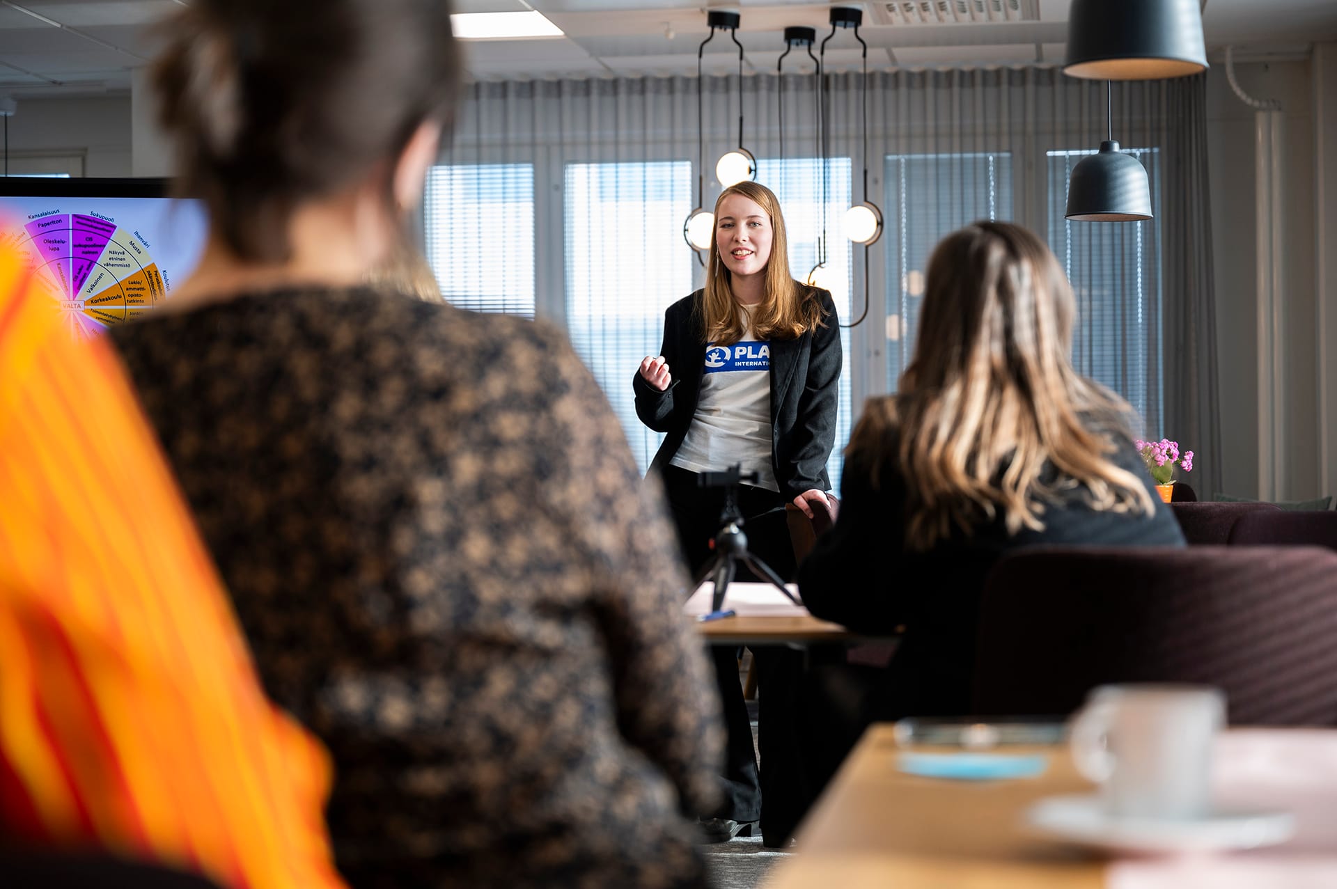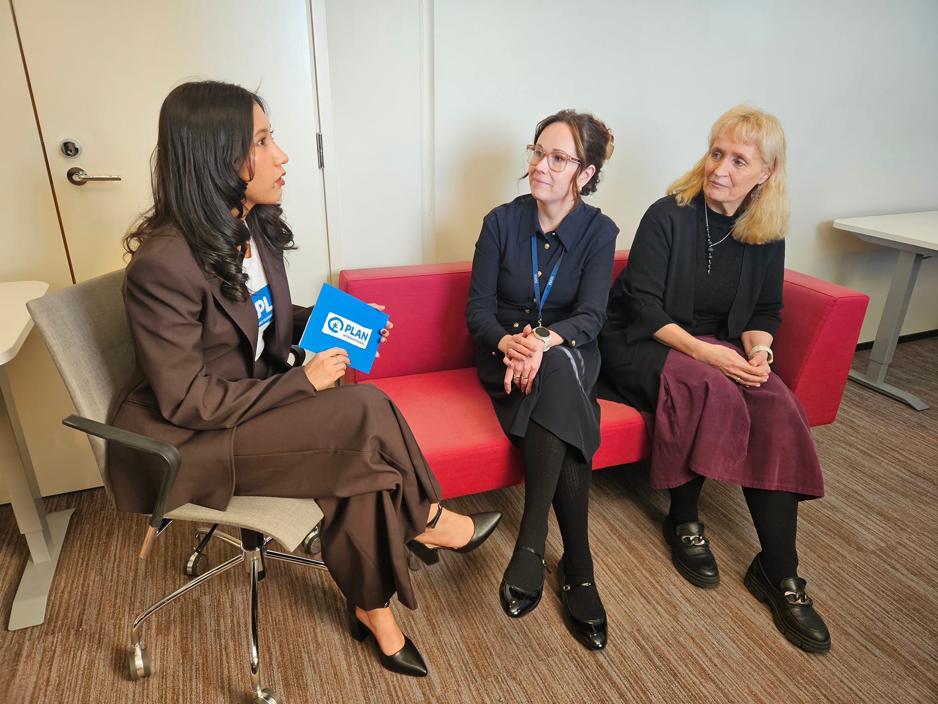 Kimya Fayaz keskusteli hyvinvointiasioiden johtajan Maria Salenius ja tutkimuspäällikkö Marianne Pekola-Sjöblomin kanssa muun muassa kuntien ja kaupungien tasa-arvo- ja yhdenvertaisuustyöstä. Kuva: Sofia Bernoulli / Plan International Suomi
