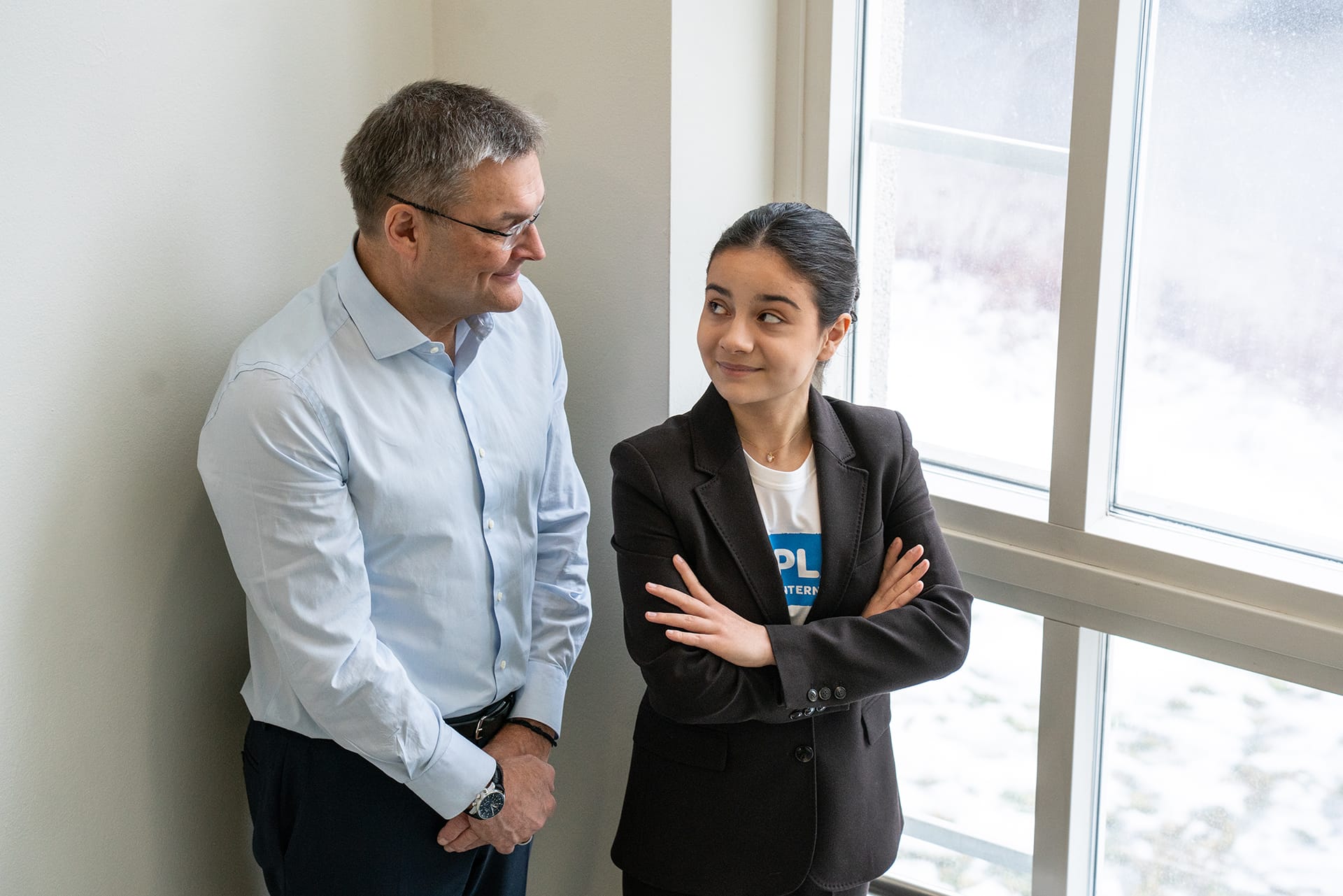 HUSin toimitusjohtaja Matti Bergendahl ja johtajan paikan päiväksi vallannut Nicol-Maria Stefanidou keskustelivat muun muassa perhevapaista ja HUSin henkilöstön työhyvinvoinnista. Kuva: HUS Hanna Raijas-Turva