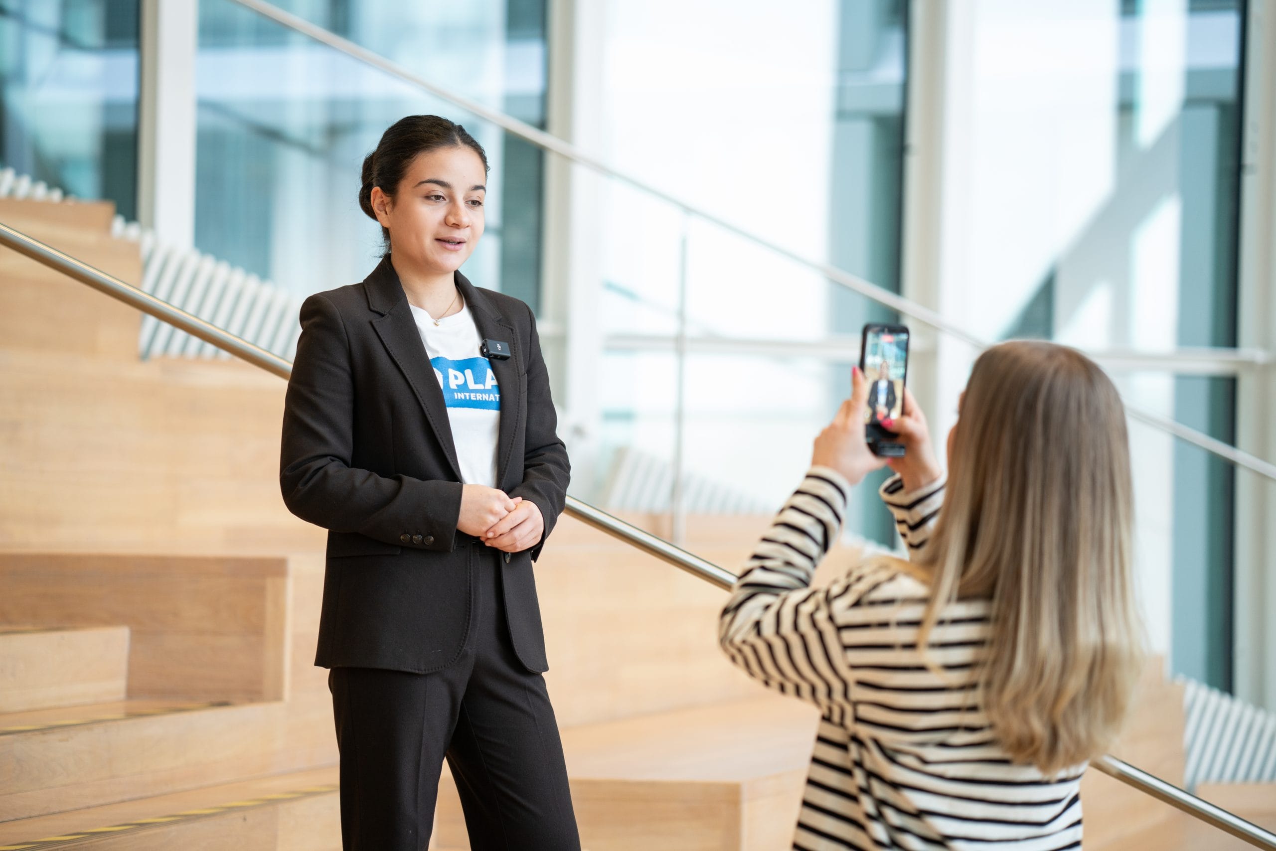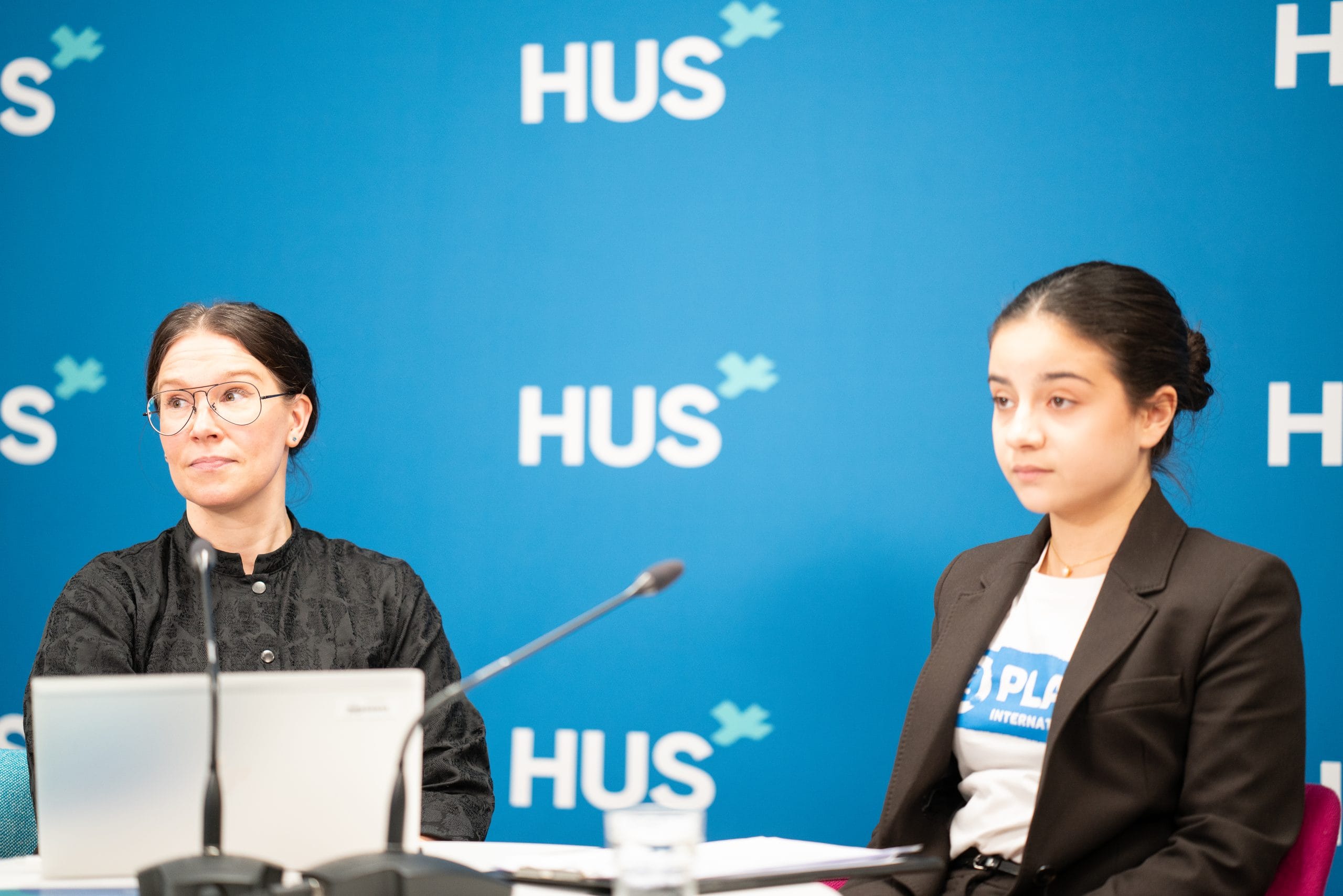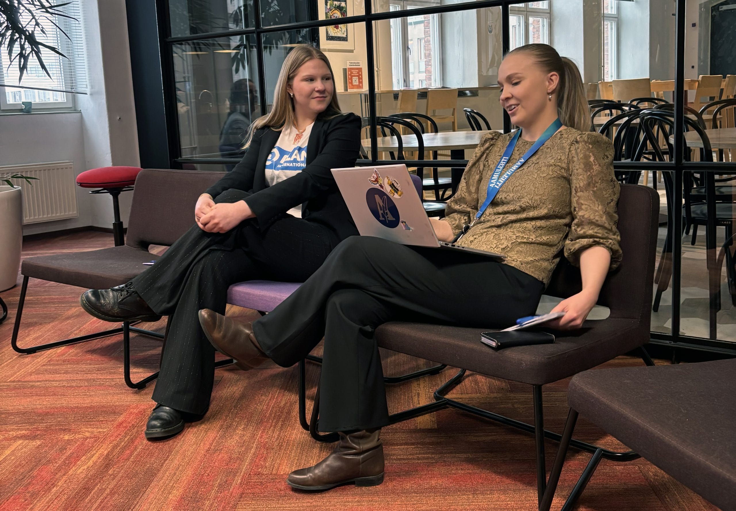 Penttinen keskusteli Aamulehden yliopistokirjeenvaihtajan Iina Thomssonin kanssa siitä, mitkä aiheet kiinnostavat nuoria ja miten Aamulehti tavoittaa nuoria. Kuva: Inka Kovanen / Plan International Suomi