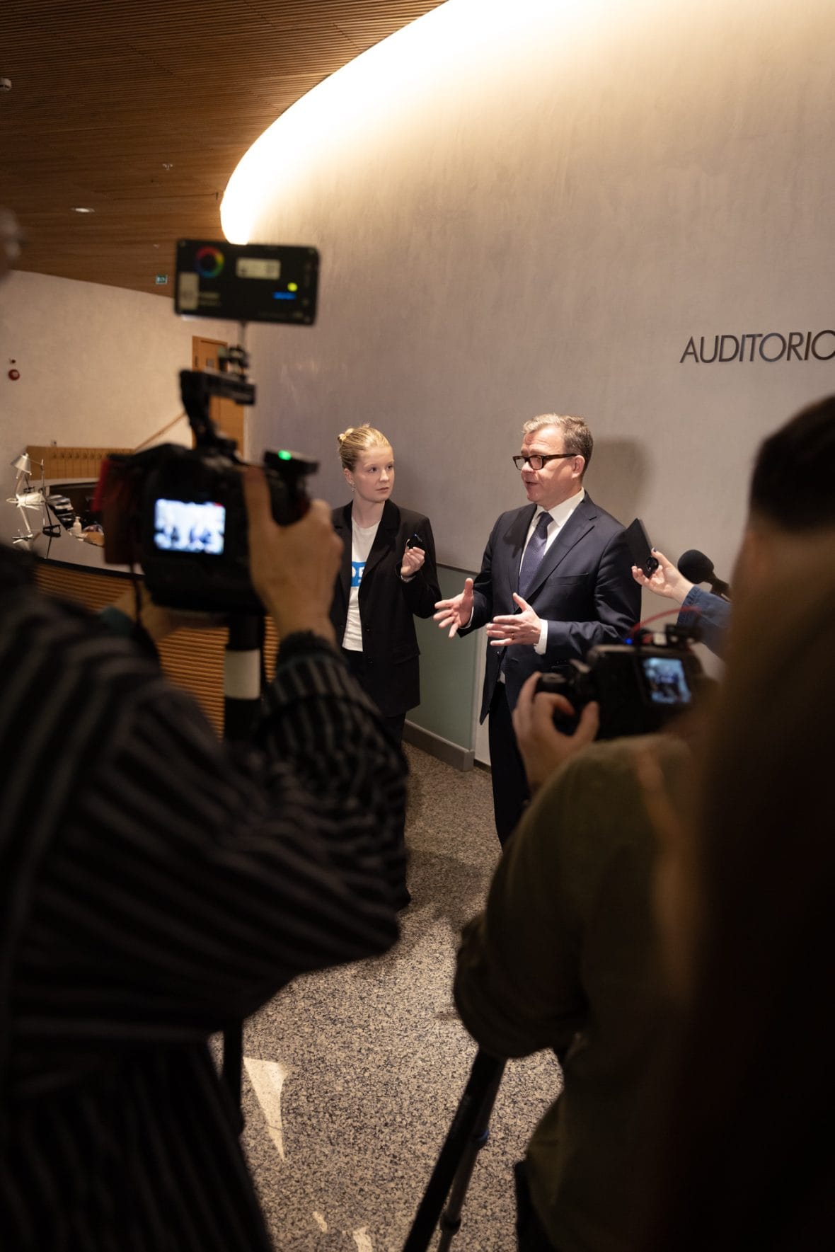 Pääministerit Annika Mikkonen ja Petteri Orpo tapasivat myös mediaa ja antoivat haastatteluja.