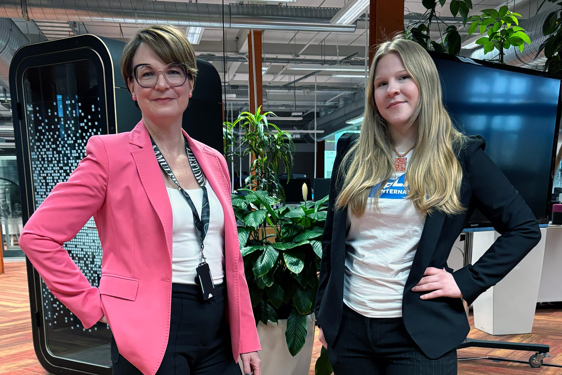 Aamulehden yli satavuotisen historian ensimmäinen naispäätoimittaja Sanna Keskinen ja päivän päätoimittaja Salla Penttinen yhteiskuvassa. Kuva: Inka Kovanen / Plan International Suomi