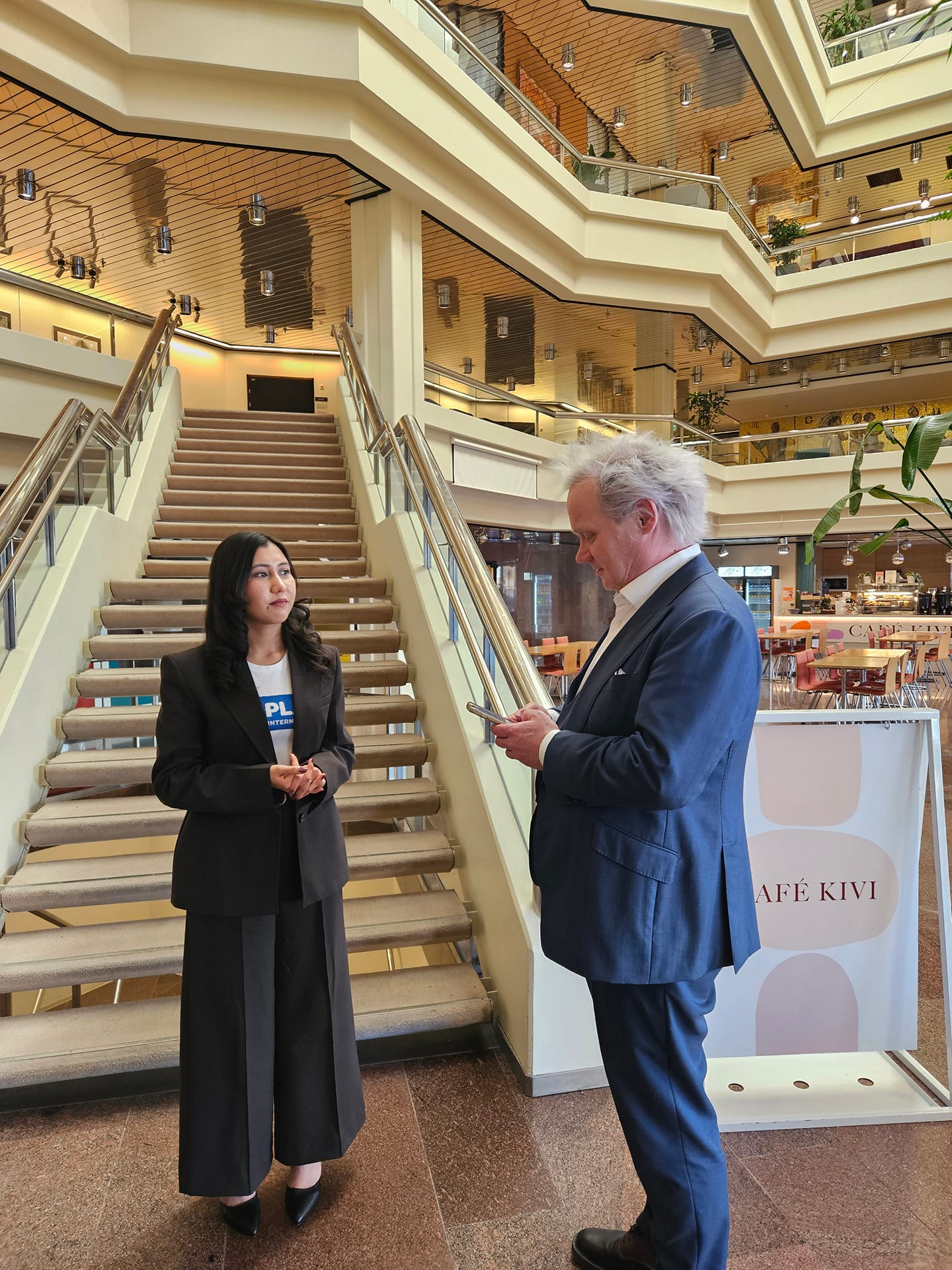 Toimittaja Jani Halme haastatteli Kimya Fayazia Kuntalehteen. Kuva: Sofia Bernoulli / Plan International Suomi